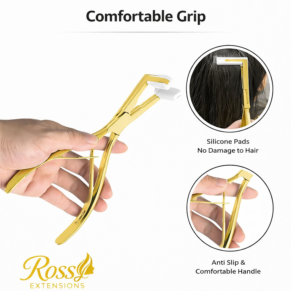 Professional hair extension tool set including hair extension pliers, hair loop tools, pulling hook, and sectioning clips. Designed for easy application, installation, and removal of hair extensions. Ideal for salon and professional use.